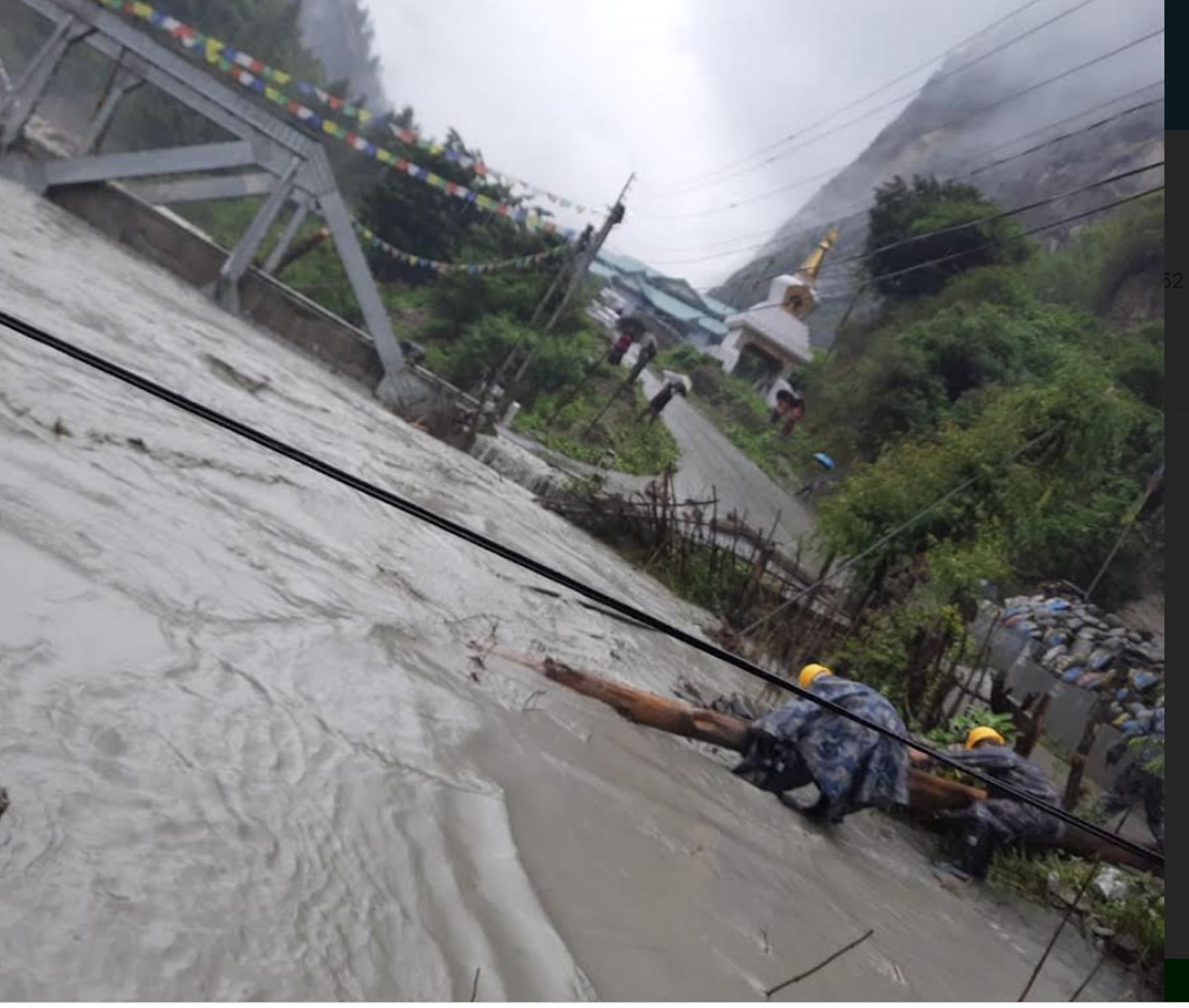 मनाङ, ६ असार मनाङको चामेबजार नजिकै थुनिएको मस्र्याङ्दी नदी खुलाउने प्रयास गर्दै सशस्त्र प्रहरी बल नं....